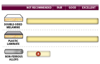 Used on panel saws and sliding table saws with separate scoring units for chip-free cuts on both sides of the material. Adjustable scoring sets consist of two 12-tooth saw blades with shims to adjust the kerf width (2.8mm to 3.6mm). Used in in combination with our plywood/laminate series triple chip blades only.