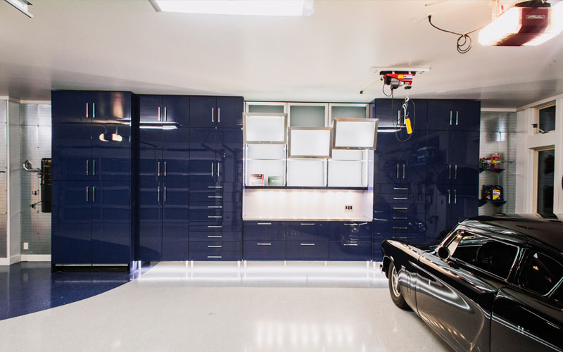 PARAPAN® high gloss solid surface acrylic doors are ideal for this garage design where impeccable design is desired and durability is essential. Cobalt Blue PARAPAN® is combined with AF003 aluminum frame cabinet doors in the brushed stainless finish with satin glass inserts for a masculine, modern edge. AVENTOS lift systems by Blum add additional functionality to the cabinetry. Image courtesy of Norcia Fine Custom Cabinetry.
