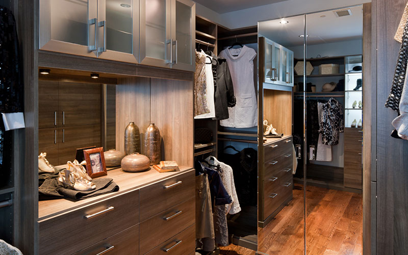 This beautiful closet features custom mirrored closet doors with a full glass overlay to add the illusion of additional space. The aluminum frame cabinet doors in AF003 profile and °eluma LED shelving in the built-in cabinetry add luxurious details to this elegant closet.