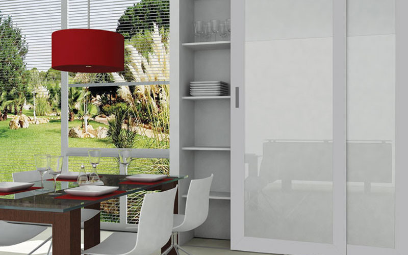 Sliding door systems are an effective way to save space in interior design. These AF007 aluminum frame sliding doors with a natural aluminum finish and white backpainted glass inserts enclose a pantry area in a small kitchen space.