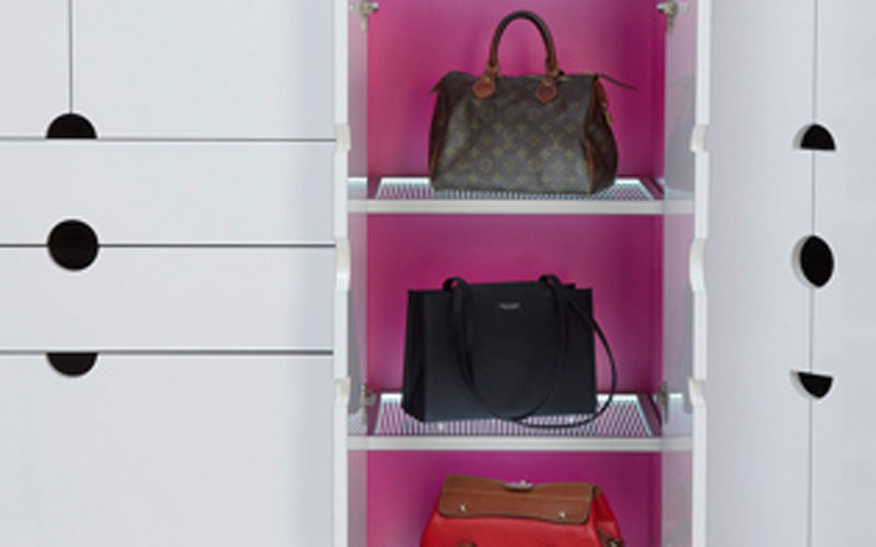 The patented lighting technology of our eluma shelving make for a great accent lighting option for your storage space. This closet features shelving with our EL001 frame in natural aluminum finish, warm LEDs and 1/16" etched glass. Image courtesy of Rev-A-Shelf.