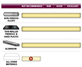 Designed specifically for cutting relatively thin-walled aluminum and non-ferrous extrusions and frames. Use a coolant or blade wax and clamp down the work piece when cutting non-ferrous metals.